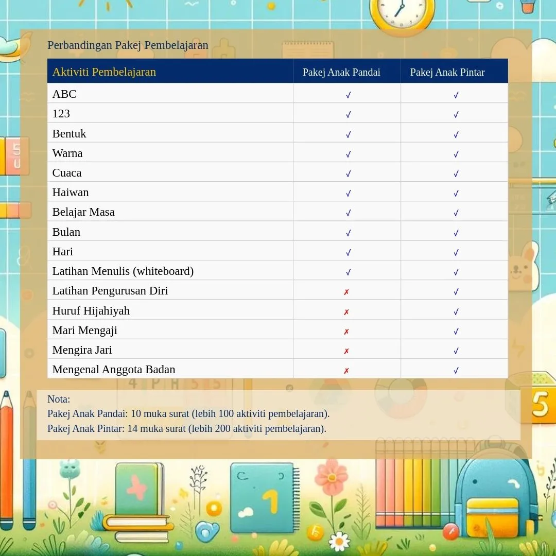 Pakej Anak Pintar: Terdapat 14 muka surat (lebih 200 aktiviti pembelajaran, anak boleh mempelajari dan mahirkan (ABC, 123, Bentuk, Warna, Cuaca, Haiwan, Belajar Masa, Bulan, Hari, Latihan Menulis (ada bahagian whiteboard), tambahan aktiviti mengenal huruf hijahiyah, mari mengaji dan tambahan aktiviti mengira jari dan mengenal anggota badan dan latihan pengurusan diri